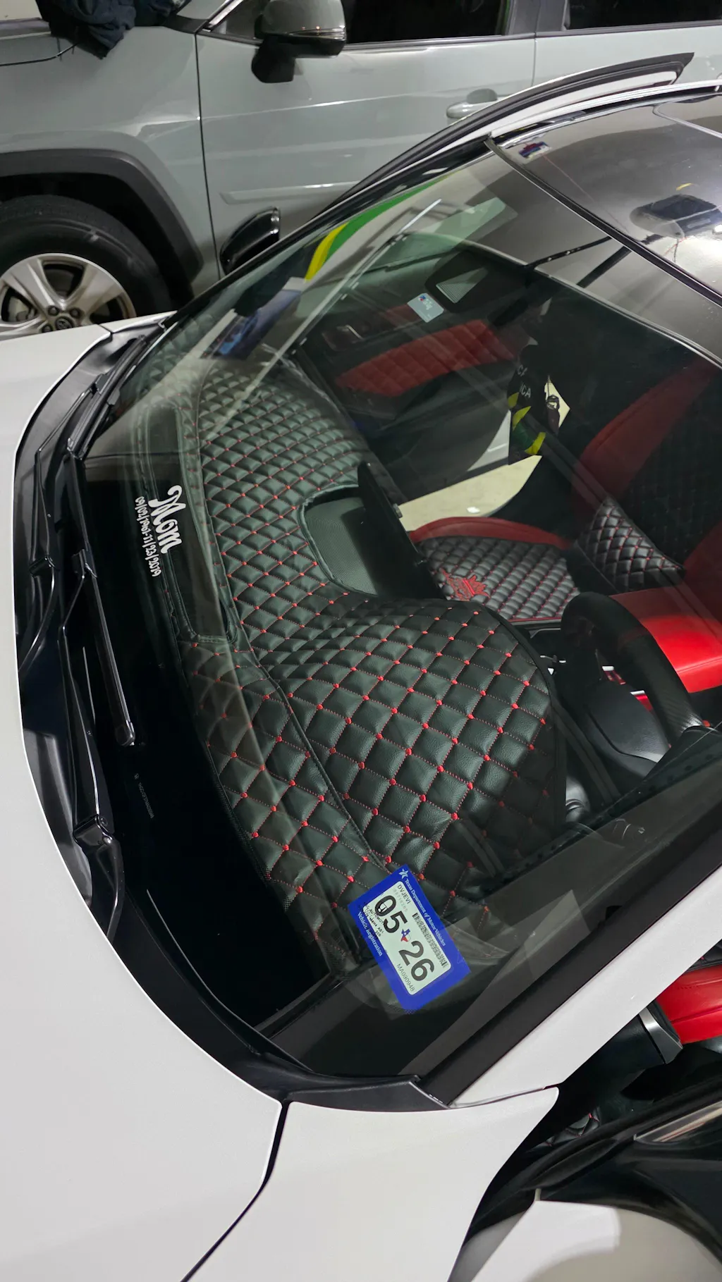 Our Material is a Special Custom PVC Leather specifically made for manufacturing hood/full masks for automobiles. Our unique material is machine washable, fire resistant, water resistant and made to handle all season elements. Our Material is backed with a soft white felt making it a smooth/soft fit for any vehicle application.
